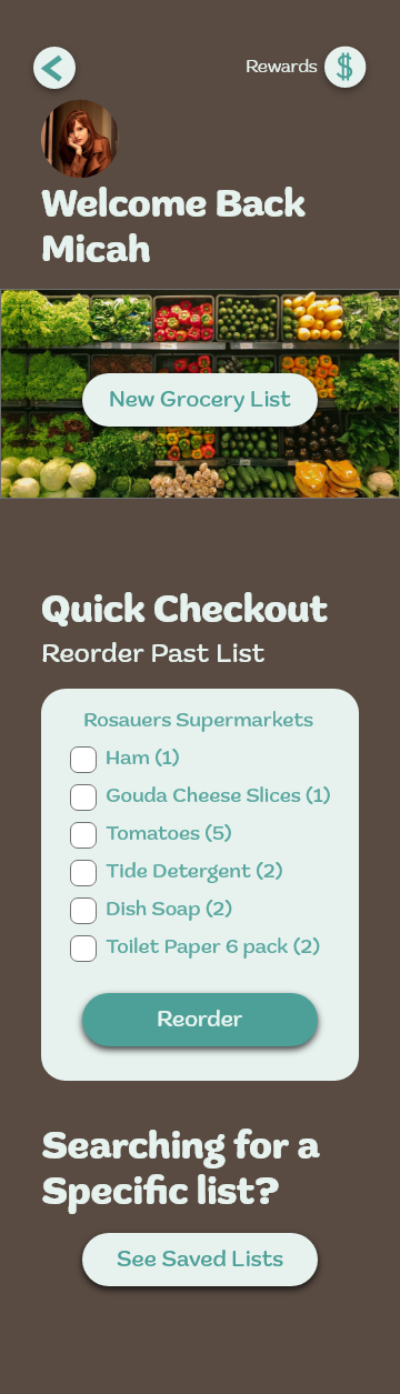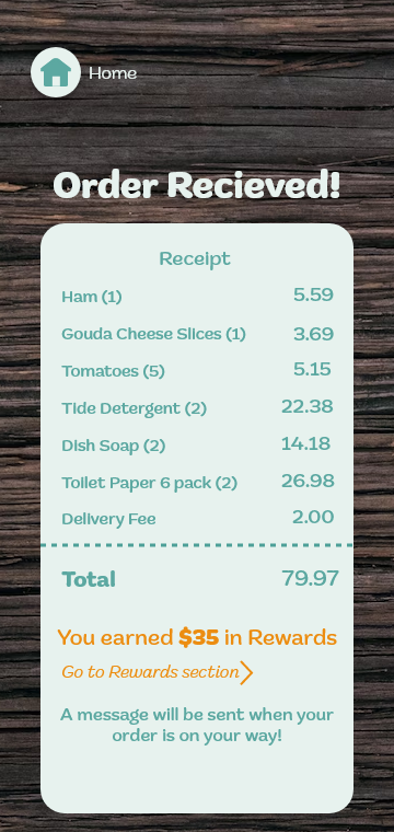 I decided to design a Food delivery service app for rural communities with a rustic theme. The main concept was to make this app budget friendly and incentivize usage of the app with a rewards system and list system that can be saved as well as automatically set up for instant purchase.